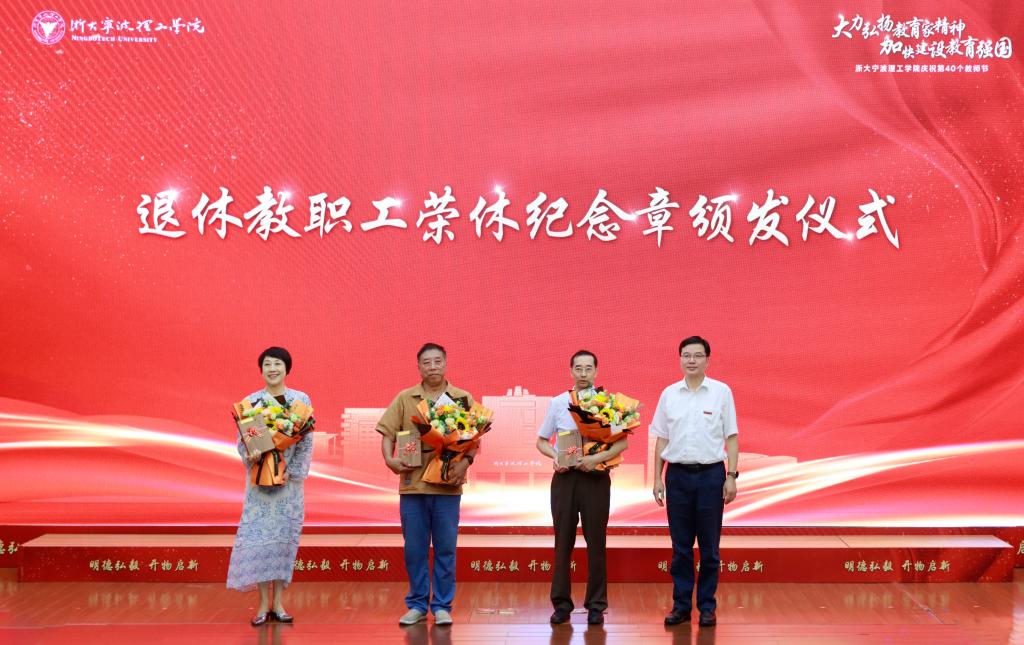 主题活动分为浙大宁理“欢迎您”“祝贺您”“感谢您”三个篇章。徐方为新教师代表佩戴校徽,全体教师和新教师代表共同宣誓。副校长章献民为先进工作者颁发荣誉证书,党委副书记黄光杰为在教学和思政领域的获奖者代表颁发荣誉证书,副校长张荣祥为在教科研领域的获奖者代表,2024年度国家自科基金、2023年度国家社科基金获得者颁发荣誉证书和纪念品,美康生物人力资源总监王晓君为“美康生物人才奖”获得者颁奖,乐歌人体工学科技股份有限公司文化传播中心主任魏露露为“乐歌奖教金”获得者颁奖,鄞州银行董事长王军辉为“蜜蜂育人奖教金”突出贡献奖获得者颁奖,鄞州银行公益基金会理事长俞峰为“蜜蜂育人奖教金”辛勤奉献奖获得者颁奖,感谢大家为学校办学发展做出的贡献。纪委书记胡文汉为任教满三十年的教师代表颁发荣誉奖章,新教师代表为任教满三十年的教师代表献花;党委副书记杨国富为退休教职工颁发荣休纪念章,优秀学生代表为退休教职工献花,感谢老师们数十年如一日的奉献和付出。