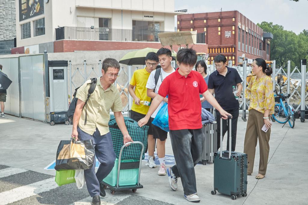孩子考上大学是家庭大事。送新生报到,对家庭成员来说可太有参与感了。记者在现场看到, 75岁的爷爷坐10多个小时的火车送孙女来上学,说“这是很荣耀的事情”;7岁弟弟送18岁哥哥上大学;还有一家人带着宠物狗送小主人来报到……浙大宁理为了让新生家长记录这一刻,在标志性建筑、校园美景处、报到处等地设置拍照打卡点。总报到处设置在学校体育馆,馆内两处打卡点成师生最爱。