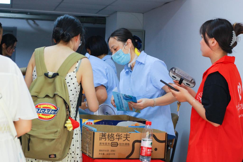 在报到点,各学院准备了各式各样的小惊喜,传法学院为每位新生提供精美的手提袋,信息学院则设置专门的拍照打卡点,数据学院开展幸运大抽奖,设计学院准备了漆扇制作活动……考虑到酷暑天气,学校还在校园内、生活区设置服务保障点,提供茶水和休息区,餐厅免费提供绿豆汤、水果和饮料等。在生活园区,特别设置水电咨询、维修咨询,以及后勤咨询等服务点,方便新生们咨询相关问题。