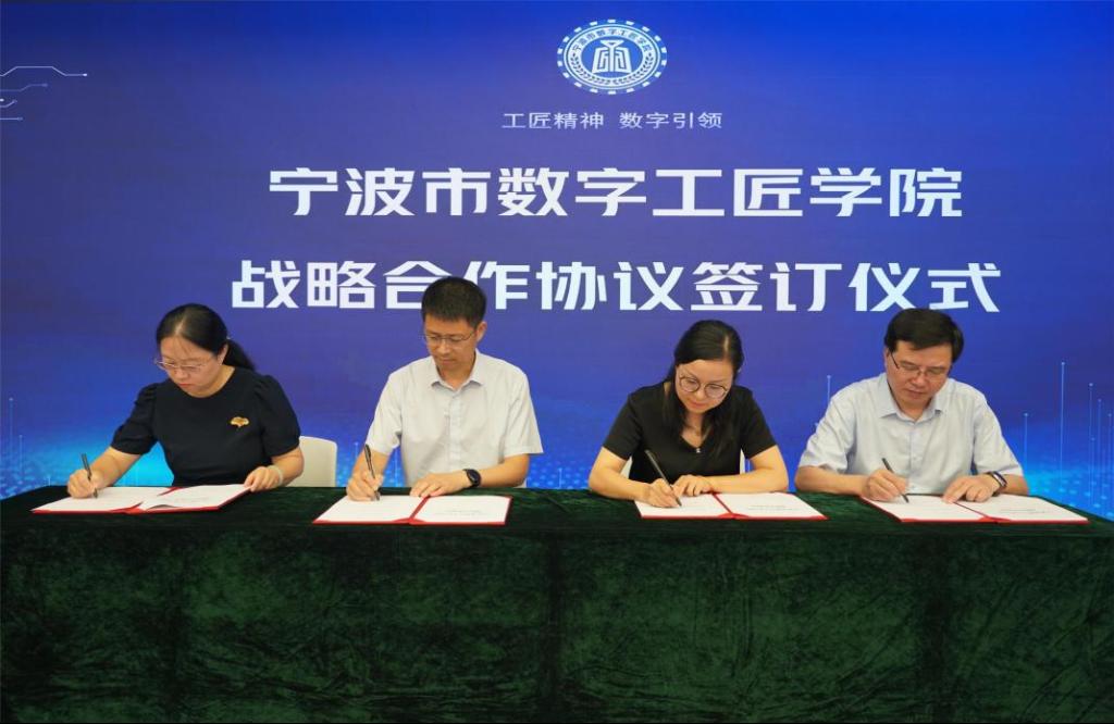 学校与宁波市数字信息产业工会、宁波市海曙区总工会、宁波第二技师学院共同签署“宁波数字工匠学院”战略合作协议。