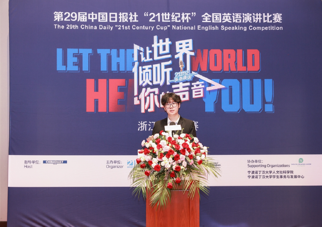 在近日举行的第29届中国日报社“21世纪杯”全国大学生英语演讲比赛浙江地区决赛中,外国语学院2021级英语专业毛皓楠同学喜获二等奖。