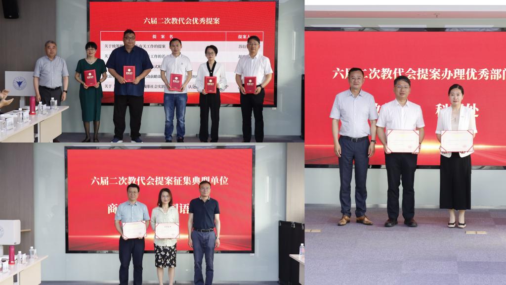同时,会议表彰六届二次教代会提案征集及办理过程中的先进个人和集体。苏衍宝、胡鹿鸣、陈伟、胡长兴、高能等五位代表的提案获评六届二次教代会优秀提案。商学院、外国语学院获评六届二次教代会提案征集典型单位。教务处、科研获评六届二次教代会提案办理优秀部门。