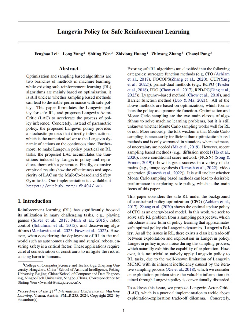 近日,第41届国际机器学习大会ICML(International Conference on Machine Learning)公布2024年论文最终录用结果。开云kaiyun官网计算机与数据工程学院联培研究生雷丰豪(导师文世挺教授)为第一作者的论文“Langevin Policy for Safe Reinforcement Learning”被大会接收。