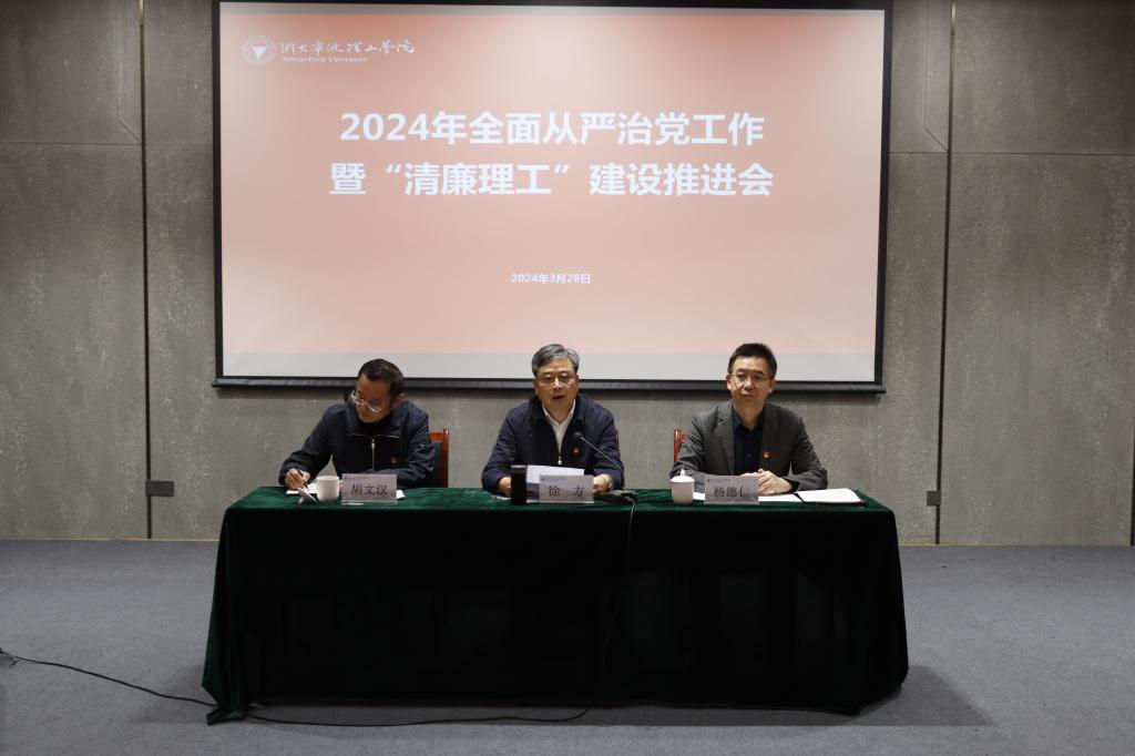 3月28日,学校召开2024年全面从严治党工作暨“清廉理工”建设推进会,全面贯彻习近平新时代中国特色社会主义思想,深入学习贯彻习近平总书记关于党的自我革命的重要思想,认真落实二十届中央纪委三次全会、省纪委十五届三次全会和全国全省教育系统全面从严治党工作会议要求,研究部署2024年学校全面从严治党、党风廉政建设和反腐败工作,持续擦亮“清廉理工”品牌,持续巩固风清气正的政治生态和育人环境,为加快建设一流创新性应用型大学提供坚强保证。