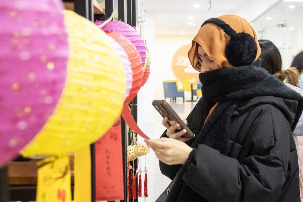 国际生对元宵节的猜灯谜这一传统极为感兴趣。他们站在灯谜前,仔细思考、认真讨论,还不时用手比划,现场好不热闹。来自阿尔及利亚的Slimane表示,这一系列元宵节活动非常有趣,套圈很有挑战性;第一次吃汤圆,味道也很独特。他还猜出了关于黄河大合唱的灯谜答案,收到了花灯礼物。