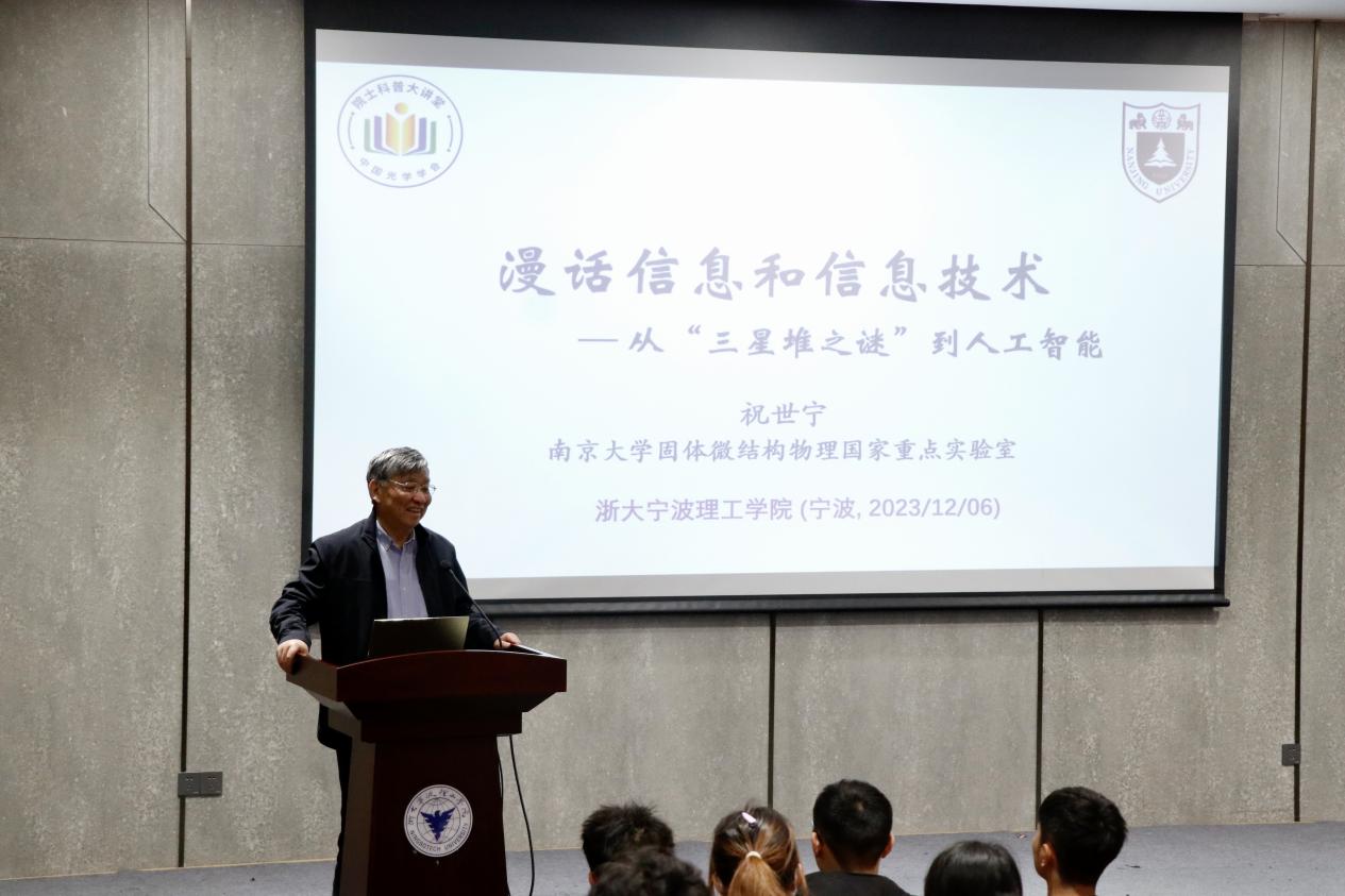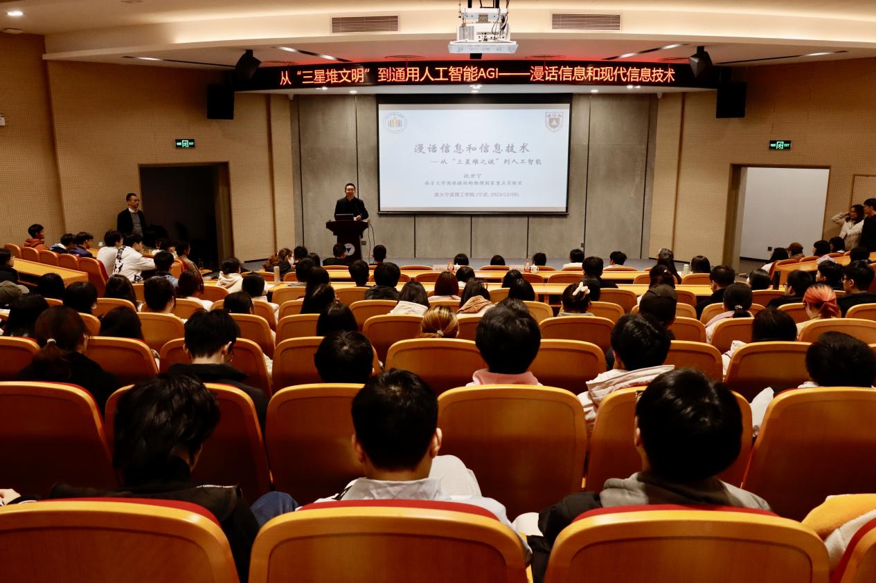 2023年12月6日下午,开云kaiyun官网在启新大讲堂举办“‘从三星堆之谜’到通用人工智能AGI”的报告讲座,中国科学院院士,南京大学教授、博士生导师,中国光学学会(COS)会士,美国光学学会会士,美国物理学会会士祝世宁先生莅临开云,和两百多位同学漫话信息和现代信息技术。校长杨德仁院士主持讲座,现场座无虚席,祝院士娓娓道来、深入浅出,同学们认真聆听,在互动环节积极发言,整场讲座反响热烈。