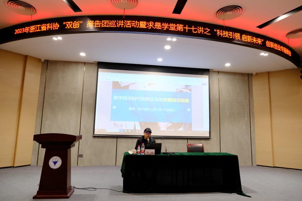 11月23日下午,2023年浙江省科协“双创”报告团巡讲活动暨求是学堂第十七讲之“科技引领 启新未来”创新创业专题报告会在学校启新大讲堂举行。数字化管理咨询与人才培养专家、政府特聘工业和信息化专家、工信部骨干人才计划总架构师、中国管理科学院数字经济研究员、牛津大学与浙江大学联合项目授课导师、浙江省人才开发协会副秘书长薛冰应邀作专题报告,近三百名师生参加报告会。