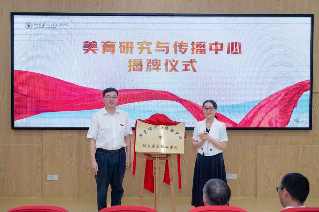 宁波市教育局党委副书记徐文姬、学校党委副书记杨国富共同为“美育研究与传播中心”揭牌。