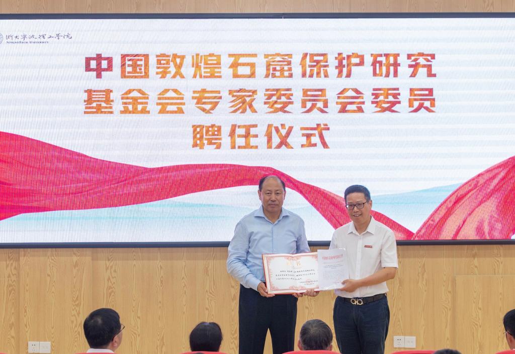 学校副校长鲁东明受聘为中国敦煌石窟保护研究基金会专家委员会委员,基金会理事长杨秀清颁发聘书。
