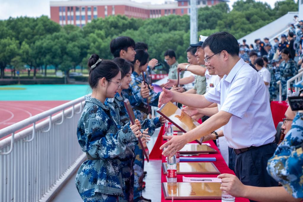 学校领导和承训部队首长为军训先进集体和优秀个人颁奖。王钊杰同学代表全体参训学员发言,他表示,军训中与战友的共同回忆、与教官的深刻情谊、根植于内心的自觉与自律,都是终身难忘的收获,在今后的学习生活中,也将坚定理想信念,强化使命担当,与学校同向同行。