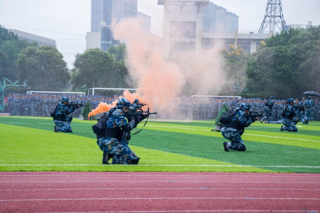 随后,伴随着慷慨激昂的《中国人民解放军军歌》,学员们踏着整齐的步伐,列队走向阅兵场。国旗队、持枪方阵、迎评申硕方阵以及各连队的方阵队伍依次迈着整齐的步伐向主席台走来,学员们个个精神饱满,步伐整齐,口号响亮,向主席台、观礼台师生汇报16天的军训成果。团体操、刺杀操、战术表演方阵,用整齐的动作、矫健的身姿、昂扬的斗志展示着新时代青年学子蓬勃向上的军容风貌,精彩的表演赢得现场阵阵掌声。