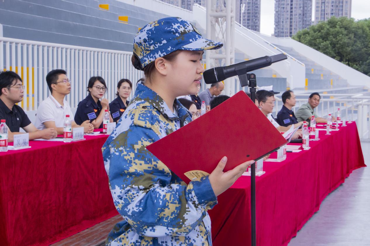 九连一排范帆同学代表全体参训学员表态发言。她号召全体同学,作为新时代青年,不仅要发出“清澈的爱,只为中国”的青春呐喊,更要以实际行动践行“请党放心,强国有我”的青春誓言。要将昂扬的斗志和饱满的热情投入到军训活动中,展现新时代青年奋发向上的决心和无限的青春活力。在接下来两周,大家要以军训为契机,心怀昂扬向上的理想,树立不坠凌云之志的信念,以顽强拼搏的姿态和毅力完成这次考验,让青春的年华在未来的征途中放射出灿烂夺目的光彩。