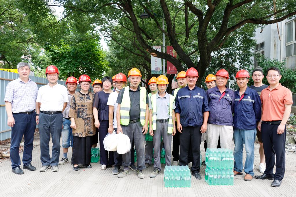 胡征宇一行先后来到门岗、食堂等后勤保障场所和教学区、生活区、石麟大楼等施工现场,慰问奋战在一线的后勤、保卫、施工人员,向大家表示感谢,为他们送上饮料、毛巾等防暑降温物品,叮嘱大家做好防暑措施,合力保障假期校园平稳有序;走进施工现场,实地查看了解作业环境、项目进展和安全设施维护情况。胡征宇指出,今年的修缮工程范围广时间紧任务重责任大,各单位要强化协同,合理规划,加强师生的提醒引导和施工的监管督导,保障餐饮卫生和施工安全,坚持安全和有序两手抓,尽可能减少对在校师生学习和生活上的影响。他强调,夏天是台风等恶劣天气环境高发季节,各单位要树牢安全意识,守好安全底线,在保障施工安全的前提下,科学安排、规范施工、加强管理、盯紧进度,确保工程质量,努力建设师生满意的精品工程。