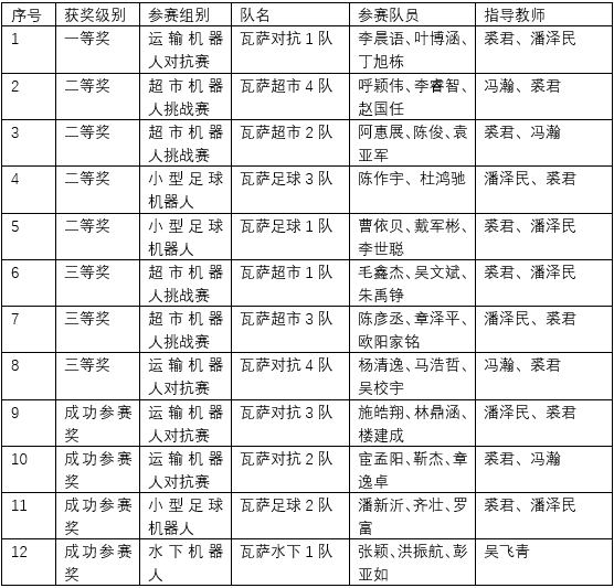 竞赛启动以来,信息学院高度重视,积极开展竞赛准备和选拔训练。在瓦萨智能科技有限公司大力支持下,经前期校内培训和选拔,学校12支队伍参加超市机器人挑战赛、小型机器人足球团体赛、运输机器人对抗赛、水下机器人四个项目比赛。比赛现场,全体参赛师生奋力拼搏,克服了调试时间短、赛场环境封闭、硬件条件限制等困难,最终脱颖而出获得佳绩。