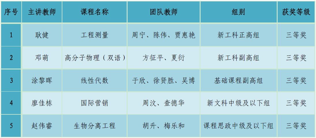 大赛自2022年11月启动,经过校内选拔,学校推荐5个教师团队参加省赛初赛。经过大赛组委会组织专家网络评审,土建学院耿健团队、材料学院邓萌团队、数据学院涂黎晖团队、外语学院廖佳栋团队和生化学院赵伟睿团队荣获三等奖。