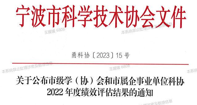 4月3日,根据《关于公布市级学(协)会和市属企事业单位科协2022年度绩效评估结果的通知》(甬科协[2023]15号),宁波市科学技术协会年度绩效评估已经出炉,校科协获得了优秀单位荣誉称号。