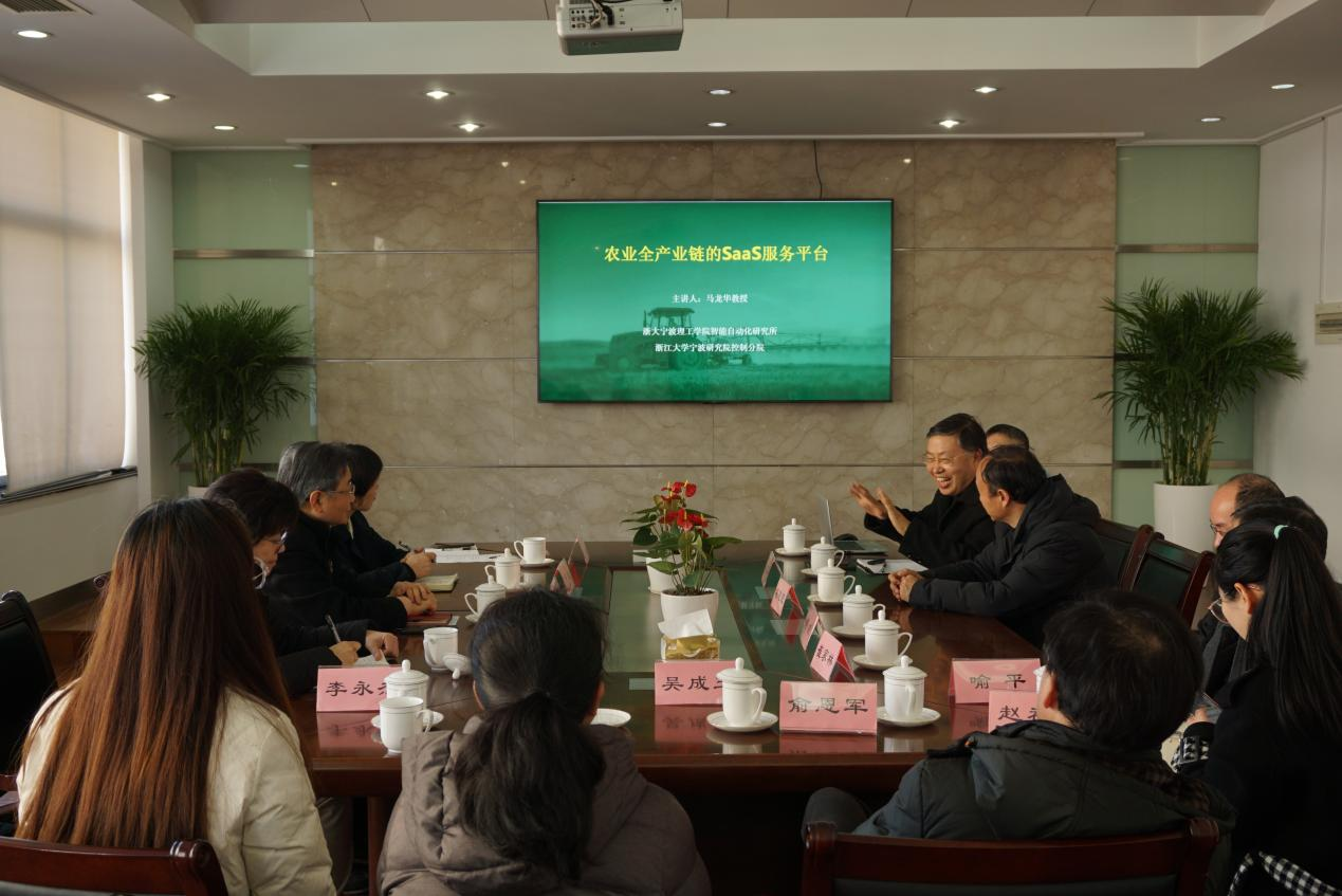 学校党委副书记冯建波对叶正波同志一行的到访表示了热烈欢迎,并为来宾介绍了宁波理工学院发展及展望。马龙华教授作为代表,主持了“数字经济赋能美丽乡村共同富裕”座谈会,并开展主旨报告。马龙华教授聚焦数字农业经济热点,围绕农业全产业链的SaaS服务平台,探讨数字化赋能农业的高质量发展路径。叶正波一行认真听取了研究所近年来开展重大项目研究和科研成果转化等相关工作,特别是有关农业全产业链服务平台运营情况的介绍,并饶有兴致地围绕智慧农业助力未来乡村建设、智能检测助力疫情精准防控等主题,与马龙华教授及其团队成员开展了深入交流。