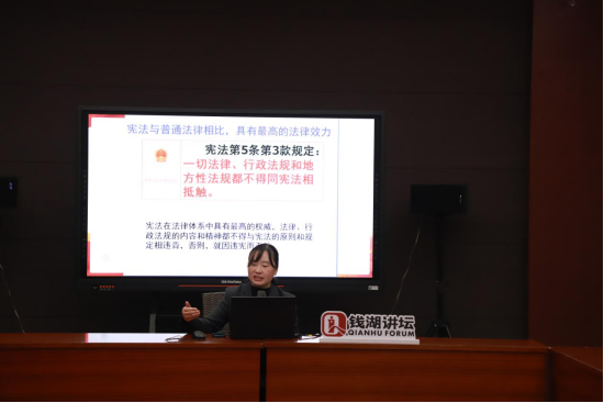 为深入学习宣传贯彻党的二十大精神,进一步提升开云学术交流品质和学术创新氛围。12月9日下午,“钱湖讲坛”党的二十大精神专题第四期在SC101会议室成功举办。前三期开讲受到师生和社会欢迎,在线直播观看人数超过2000人次。地方立法与行政法治研究中心副主任,宪法学与行政法学博士,俄罗斯库班国立大学访问学者,浙江省律协政府法律顾问委员会委员,浙江省律协行政专业委员会委员,宁波市农业农村普法讲师团成员,宁波市行政立法专家库专家,浙江省法学会宪法与地方立法学研究会理事,开云kaiyun官网传媒与法学院副教授陈丹应邀主讲。