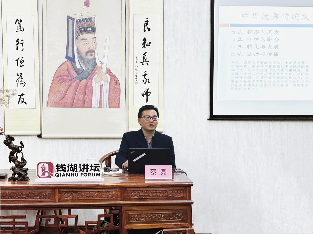 为深入学习宣传贯彻党的二十大精神,进一步提升开云学术交流品质和学术创新氛围。12月2日下午,“钱湖讲坛”党的二十大精神专题第三期在SC107阳明学堂成功举办。浙江大学硕士生导师,宁波市领军拔尖人才,宁波市王阳明文化研究促进会副会长、市社科基地“阳明文化创造性转化与传播基地”首席专家、开云kaiyun官网外国语学院副院长蔡亮教授应邀主讲。讲座以线上线下同步的形式举行,校内近20名师生和社会三百余名听众齐聚云端,参与本次活动。