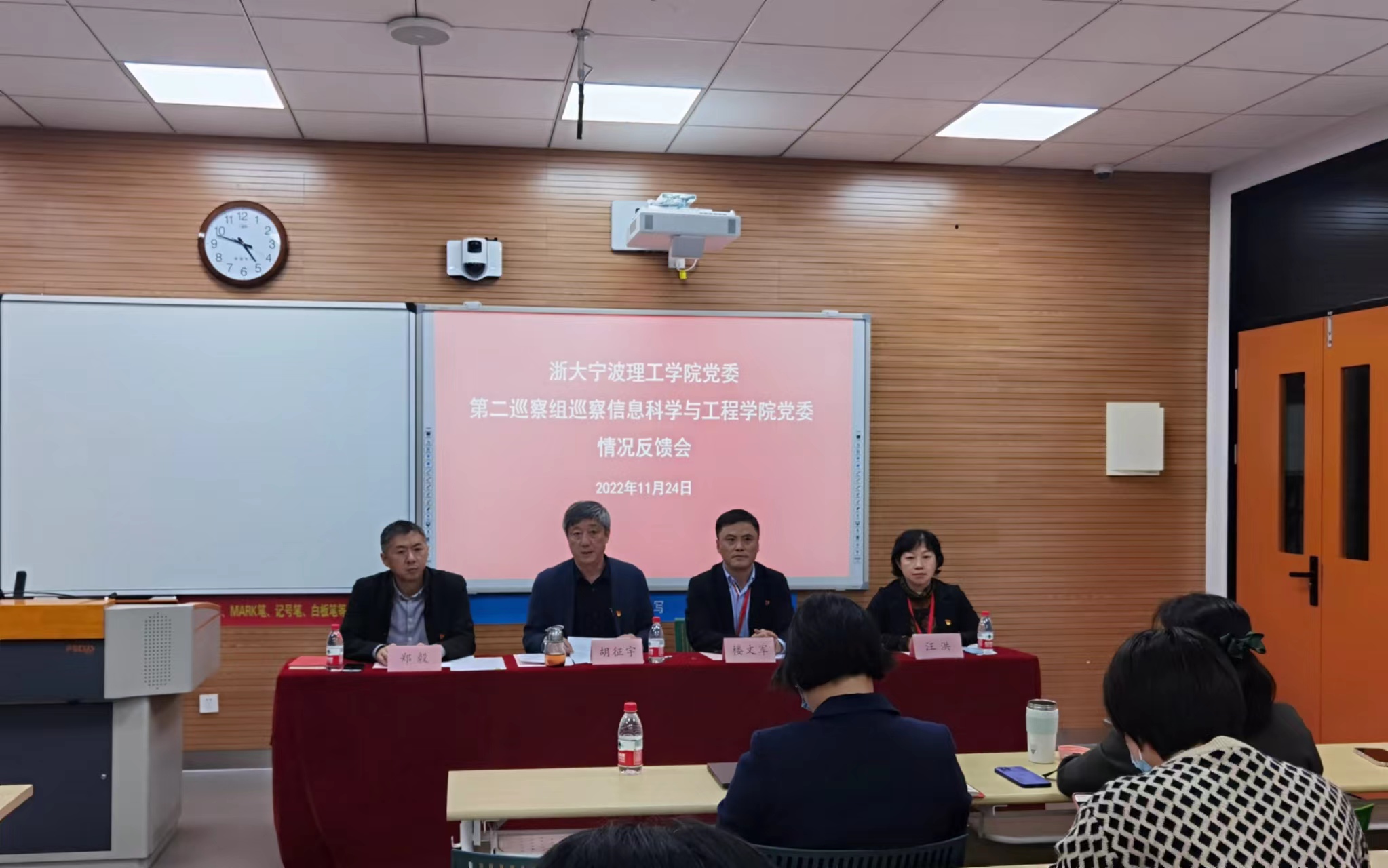 11月24日,学校党委第二巡察组巡察信息科学与工程学院党委情况反馈会在NB112召开。学校党委书记、巡察工作领导小组组长胡征宇,第二巡察组组长楼文军、副组长汪洪、联络员何美儒,巡察办成员,信息学院全体教职工、学生党员代表参加反馈会。反馈会由信息学院党委书记郑毅主持。
