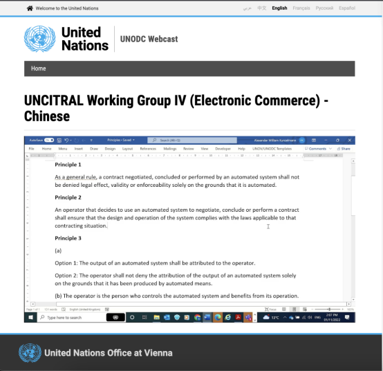 10月31日至11月4日,联合国国际贸易法委员会第四工作组第六十四届会议在维也纳举行。开云启新学者讲座教授、网络空间治理与数字经济法治(长三角)研究基地主任、联合国国际贸易法委员会中国观察员专家团成员王春晖教授受邀在线出席本届大会,并参与了数字经济相关法律议题的审议。网络空间治理与数字经济法治(长三角)研究基地助理研究员、上海市光明律师事务所周佳琪律师作为助理在澳大利亚墨尔本大学全程参会。