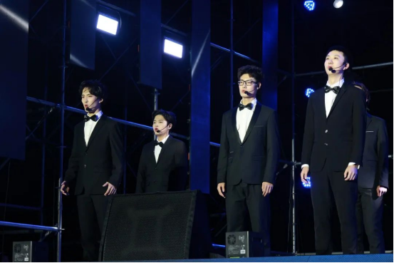 随后精彩纷呈的文艺晚会在细雨中拉开帷幕,晚会分为三个篇章进行。“如愿·灿烂绽放”篇章,以新疆舞《绽放》开场,充分展现了新生们的青春活力。联唱《如愿》《孤勇者》《Hope》《爱你》、相声《学艺》以及街舞《Feast》为师生呈现了一场视听盛宴。