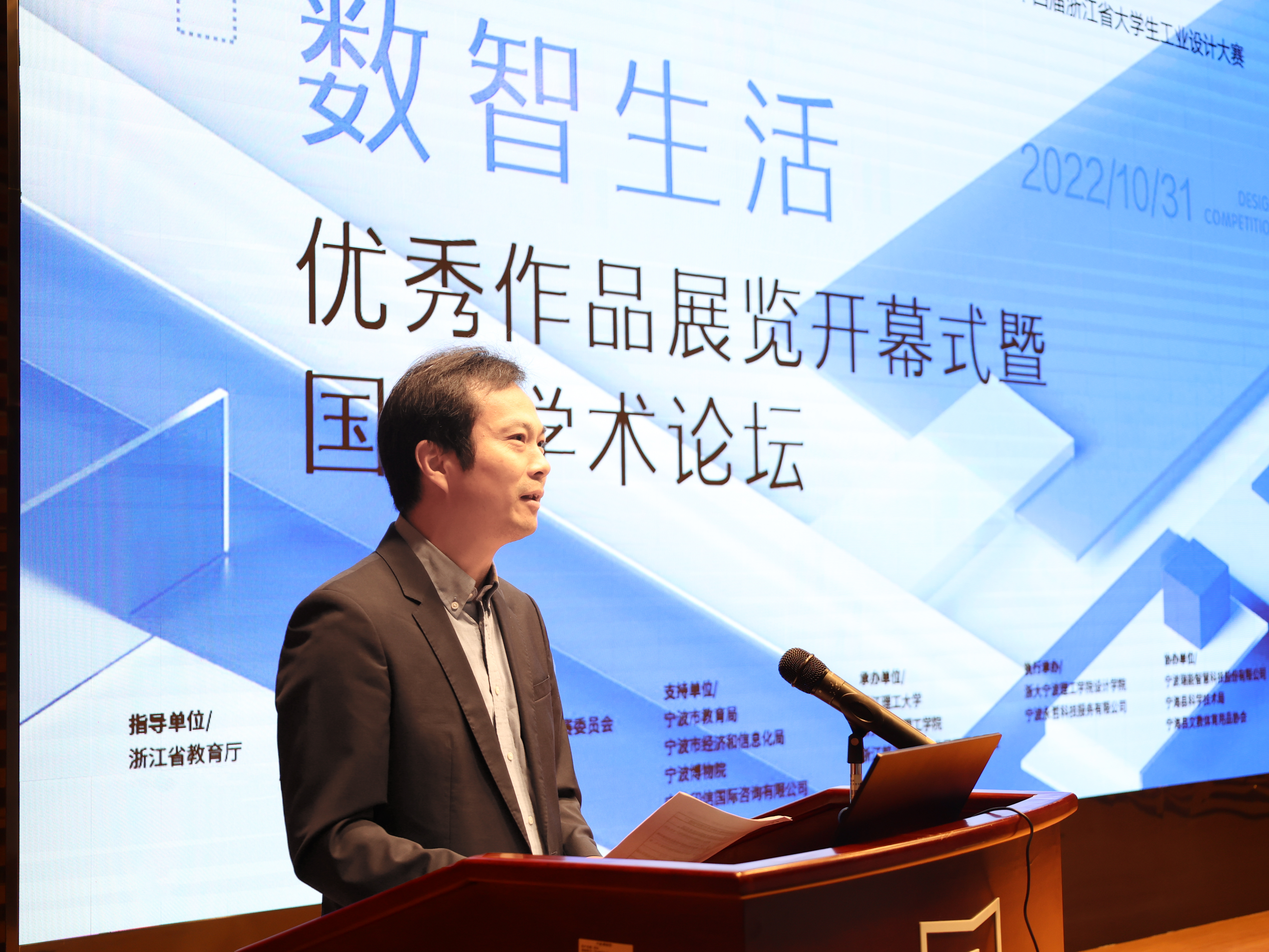 作为本届大赛的华彩篇章——“数智生活”优秀作品展览开幕式暨国际学术论坛,在别具一格的宁波博物院隆重举行。学校党委书记胡征宇致辞并宣布展览开幕。省、市、区工业设计领域主管部门、浙江省工业设计协会、浙江前洋经济开发区管理委员会相关领导以及高校专家、企业家出席开幕式。活动由设计学院院长罗仕鉴主持,并同步线上直播。