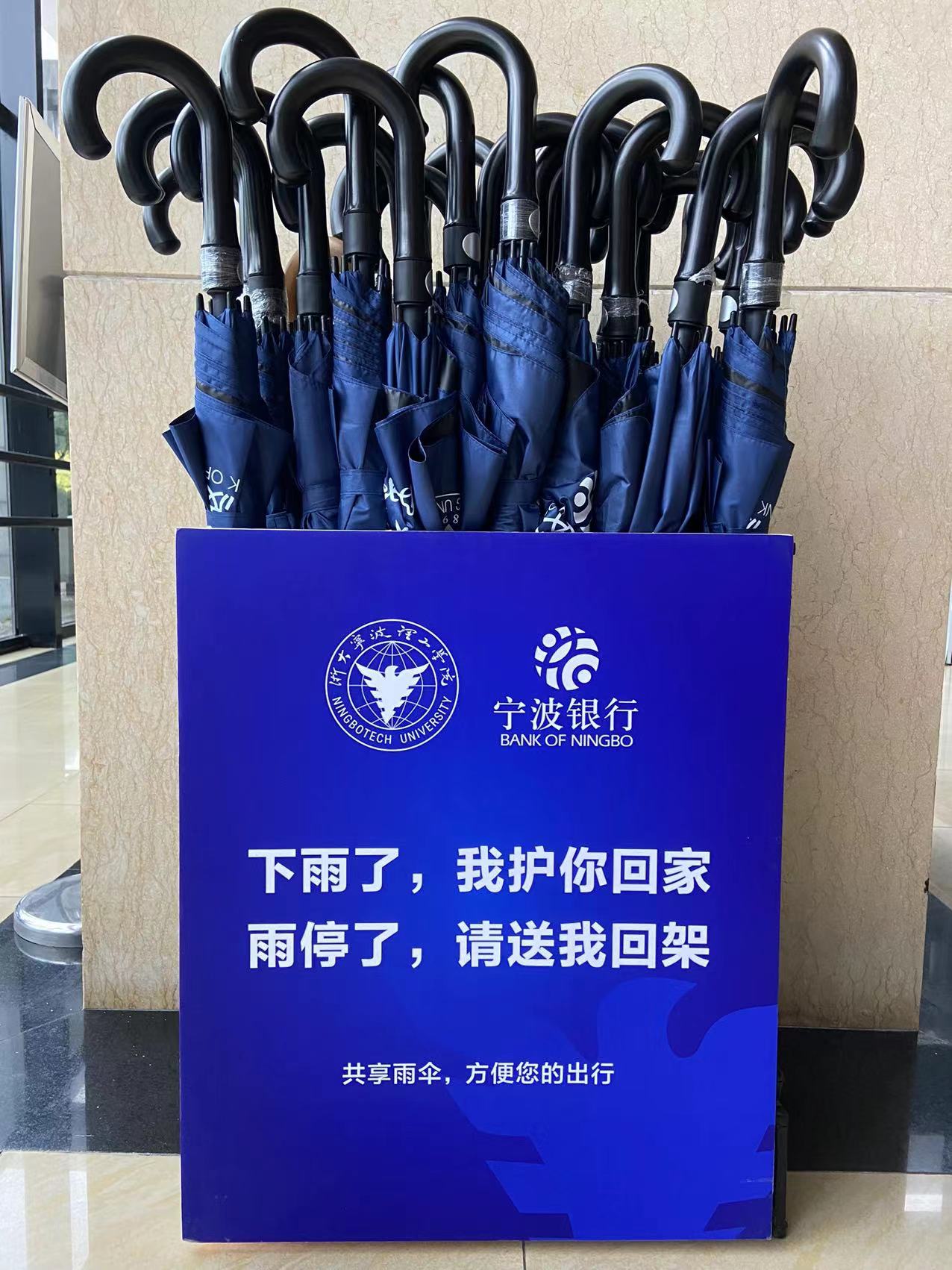 共享雨伞由宁波银行鄞州支行公益捐赠,机关党委与宁波银行鄞州支行深化本地校企关系,推进信息互通,合作共赢。