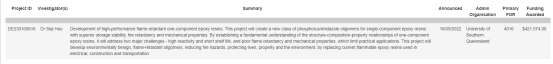 博士后霍思奇依托我院方征平教授团队在阻燃含磷环氧树脂领域进行了大量研究;针对单组份环氧树脂阻燃性能差,潜伏期短的缺陷,设计合成含磷阻燃咪唑类潜伏性固化剂,以制备兼具阻燃抑烟,长效潜伏的单组份环氧树脂。另外,为解决环氧树脂阻燃及综合性能的权衡问题,设计合成含磷低聚物型协同阻燃剂,以制备火安全-透明-强韧环氧树脂。博士后霍思奇此次获批的DECRA正是基于上述研究成果提出。