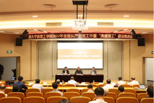 图为2022年5月召开的学校全面从严治党工作暨“清廉理工”建设推进会上,面向全体中层干部就高质量完成巡视整改工作进行再部署。