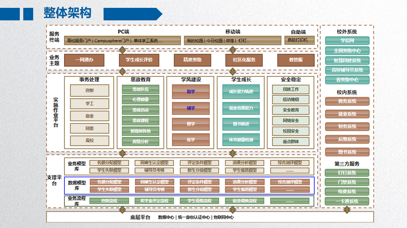“智慧学工”系统顺应新时代教育评价改革的时代浪潮,在学校大力推进数字化改革的背景下,以“五育并举”为导向,在创新构建大学生综合发展评价指标体系的基础上,综合运用数字化技术、数字化思维,聚焦学生成长,建设涵盖学生从入校、在校、离校全学涯周期的大学生综合发展实时评价、发展引导和教育管理的智慧化系统。“智慧学工”系统于2022年上半年受立学校数字化改革项目,第一期建设经费150万元。