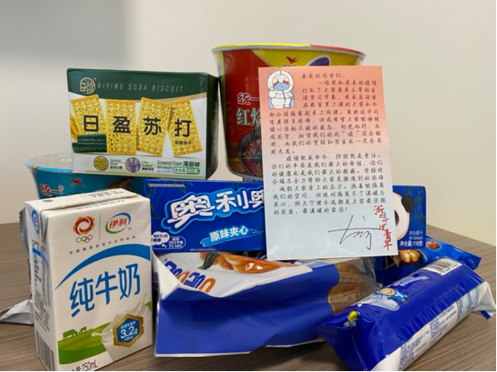 同时,学校也时刻牵挂着被隔离同学,对他们给予了特别的关怀。学校精心准备了慰问品,制作了有党委书记胡征宇亲笔签名的慰问卡片,表达对隔离同学的慰问。