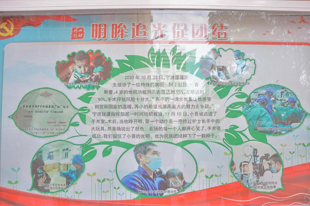 备受感动的是:2020年10月30日,宁波援疆医生接诊了一位特殊的病例——阿卜杜拉·吾斯曼。4岁的他视功能损失右眼达到95%、左眼达到90%,手术风险十分大。“再小的一滴水,也要让他感受到党和国家的温暖;再小的希望,也要用最大的努力去争取。”宁波援疆指挥部第一时间组织救治。11月10日,小吾被送进了手术室。术后,当他睁开眼,第一个动作是一把抢过护士手中的大玩具,并准确说出了颜色,在场的每一个人都笑了,手术很成功。