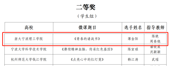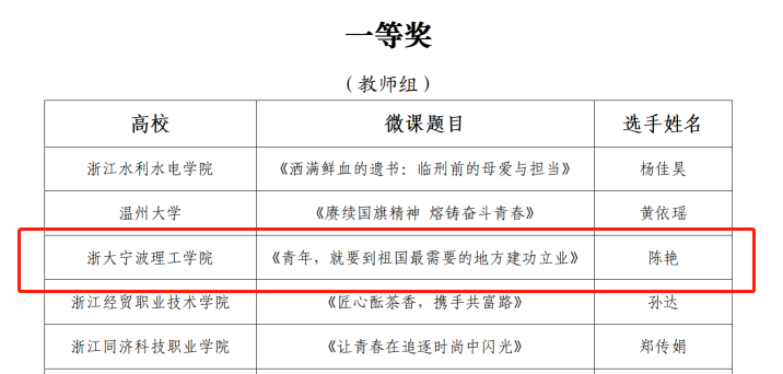 近日,由共青团浙江省委、浙江省教育厅、浙江省学生联合会主办的2022年浙江省高校思政微课大赛落下帷幕,开云报送的6件作品经过激烈角逐,最终获一等奖1项、二等奖1项、三等奖1项,在获奖数量和质量上取得历史最好成绩。