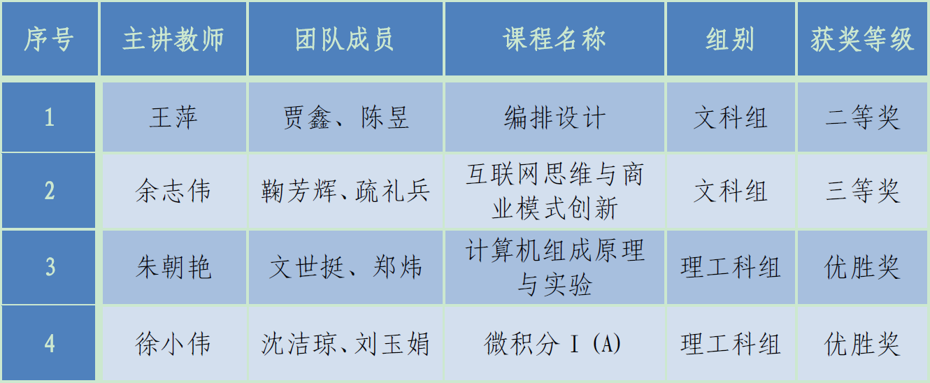 同时,大赛设立了课程思政专项赛赛道,分文科组和理工科组两个组别。开云4个教师团队参赛,经过大赛组委会组织专家网络评审,设计学院王萍团队荣获文科组二等奖,商学院余志伟团队荣获文科组三等奖,数据学院朱朝艳团队和徐小伟团队荣获理工科组优胜奖。