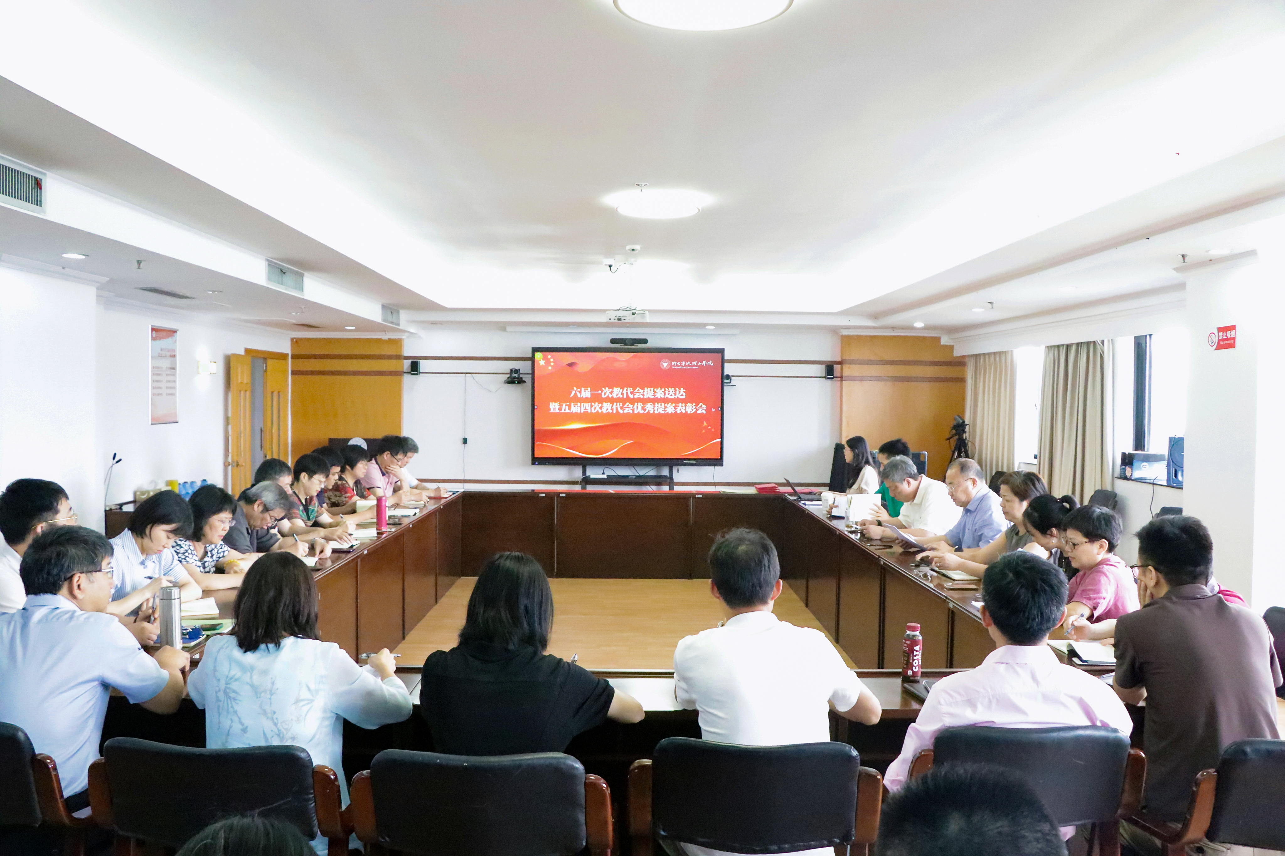6月15日下午,六届一次教代会提案送达会暨五届四次教代会优秀提案表彰会在行政楼606会议室顺利召开。教代会提案委员会委员、各代表团团长、各部门主要负责人、优秀提案代表、提案征集典型单位代表、提案办理优秀部门代表等相关人员参会。学校党委书记胡征宇和学校党委副书记、校工会主席李凤旺出席会议。