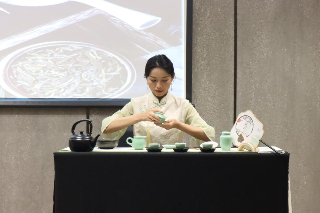 王岳飞教授以浙江大学“历史悠久,底蕴深厚”的茶学专业导入,做《科技创新与中国茶产业未来》主题报告。他从“中国茶,冠世界”“茶性廉,和天下”“知茶性,成分珍”“喝茶健,寿众生”“辩体质,科学饮”“科技新,茶未来”六大板块详细阐述了“茶产业、茶文化、茶科技、茶健康、茶生活、茶产品”内容,让同学们深入了解了国内外茶产业发展现状、茶的起源及茶文化影响力、茶叶科技与产品开发研究进展、茶叶健康及保健作用研究进展以及如何科学健康饮茶。此次讲座,王岳飞教授不但讲授了茶文化的知识,还从立德树人的角度分享了作为“学生最喜爱的班主任”中的工作经历,勉励同学们要保持健康向上的生活习惯,在青春的年华里矢志奋斗、茁壮成长。讲座最后,来自浙江大学茶艺队的三朵“茶花”,现场为师生进行了茶艺表演,在古韵十足的伴奏声中,大家近距离感受了茶艺的优美和茶道的内涵。