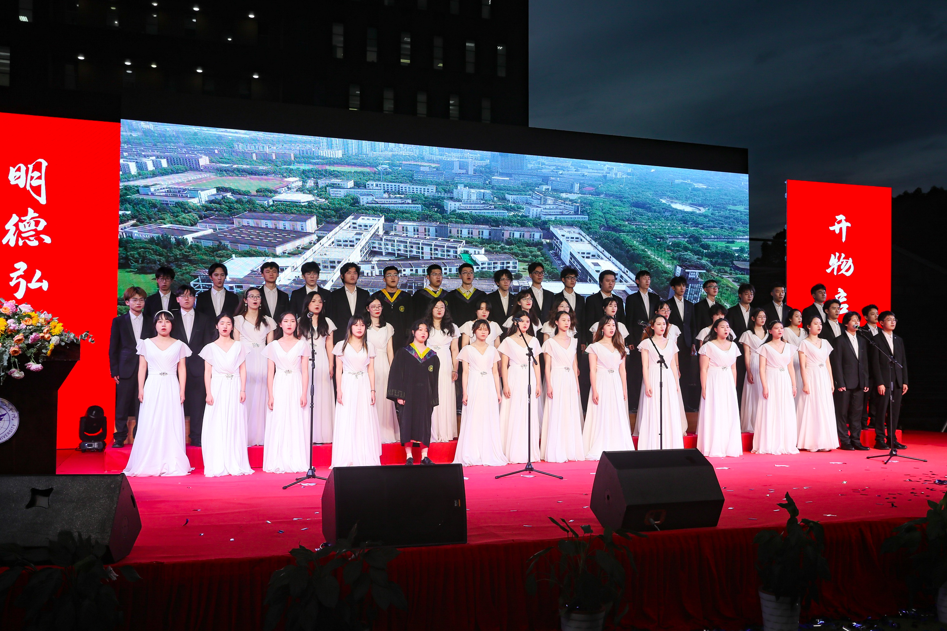 典礼在心声合唱团的校歌合唱中落下帷幕。在毕业生学位授予仪式上,学校领导为毕业生颁发毕业证书、拨动流苏,并合影留念。