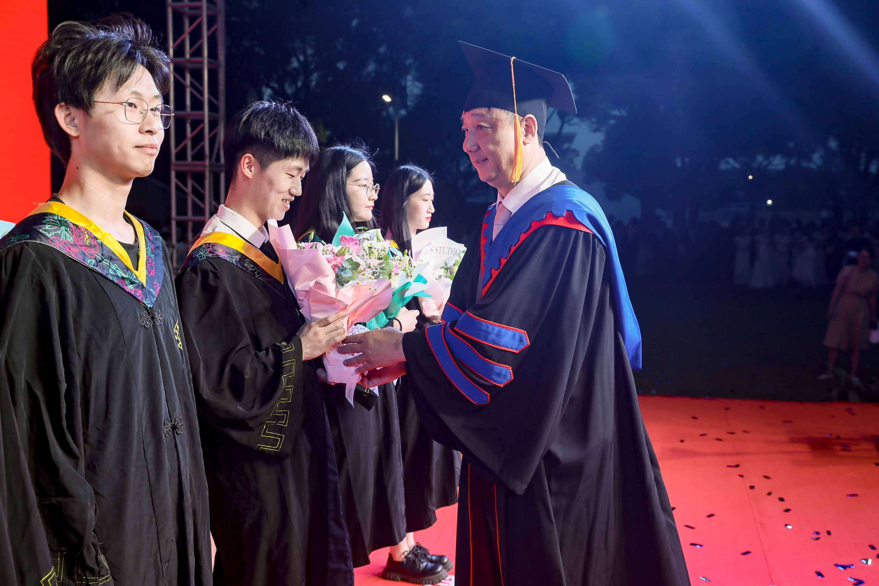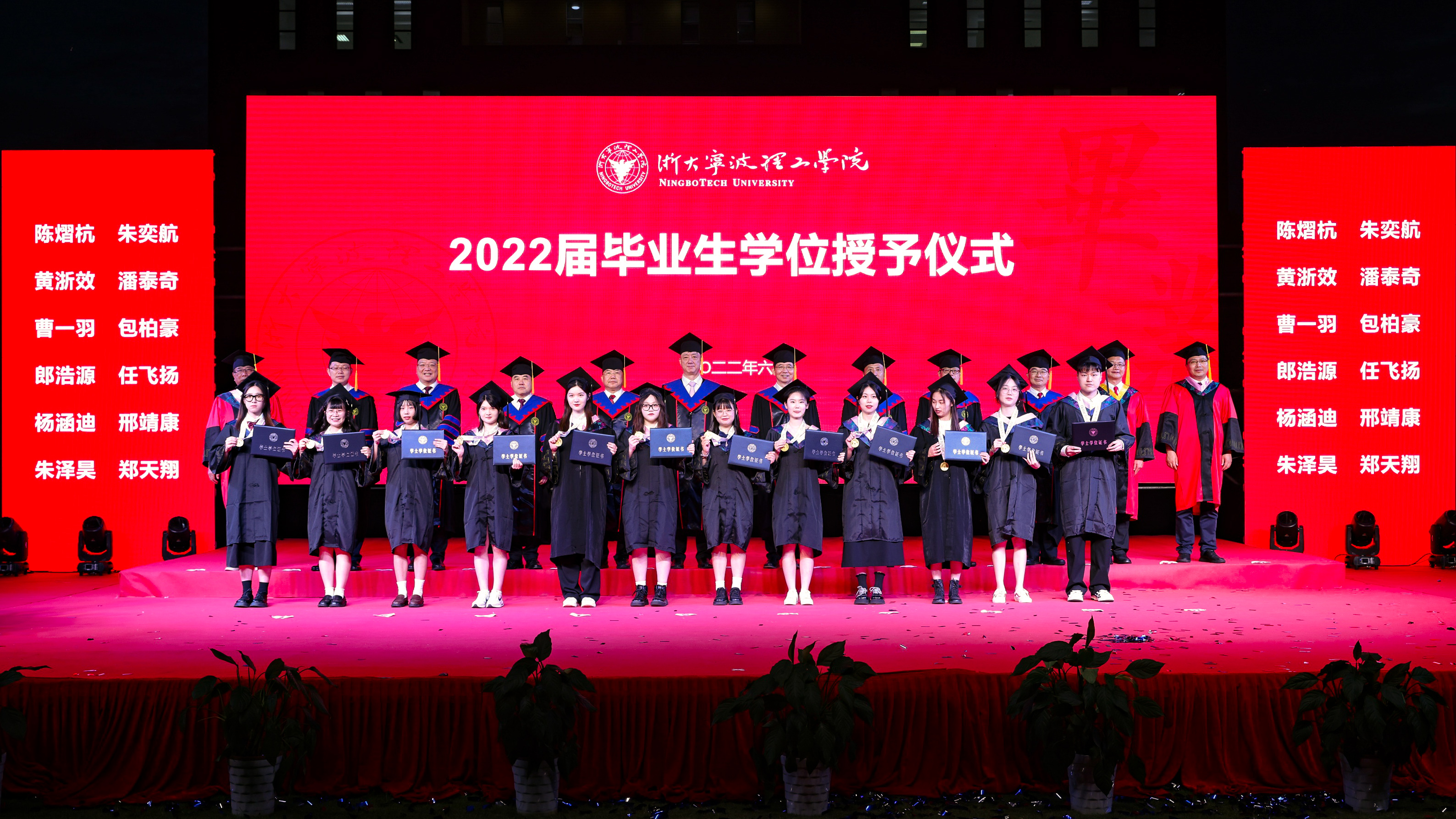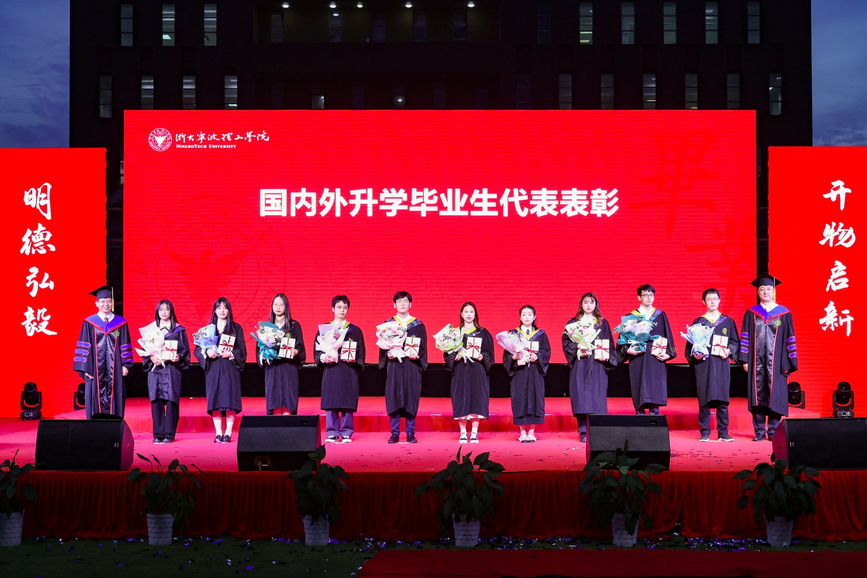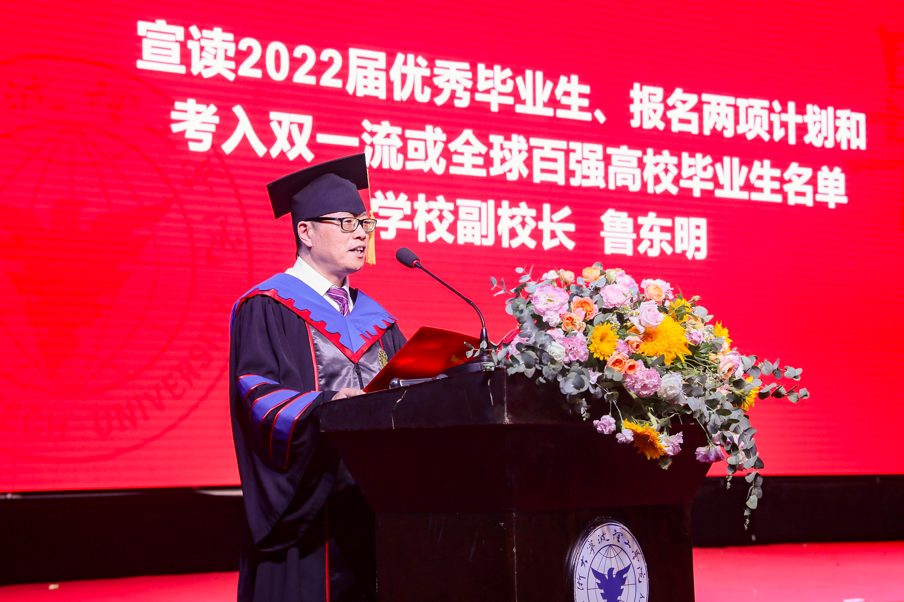党委书记胡征宇、校长杨德仁为国内外升学毕业生代表、优秀毕业生代表表彰。副校长鲁东明宣读2022届优秀毕业生、报名两项计划和考入双一流或全球百强高校毕业生名单。