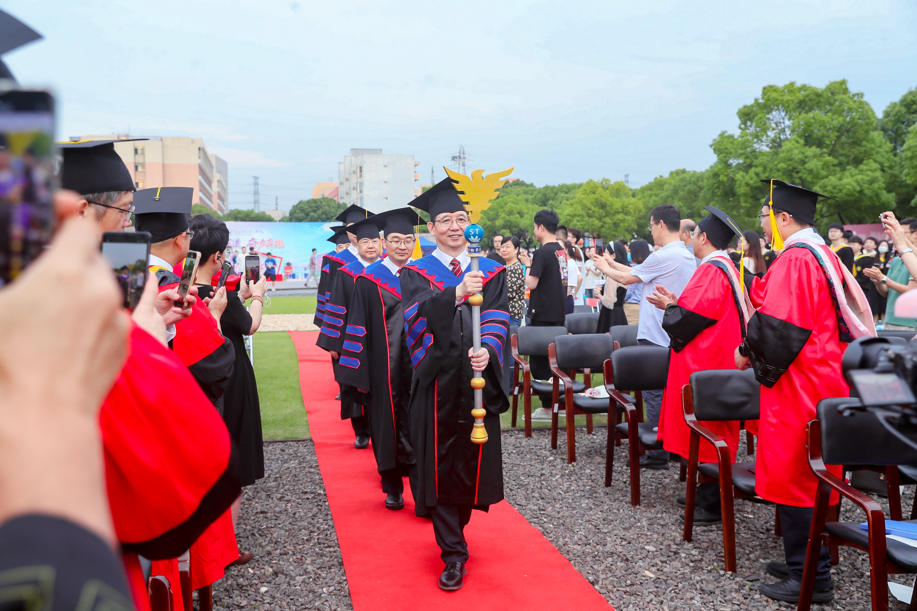 校长杨德仁院士手持学术权杖,与学校、学院领导,导师们一同步入会场。他深情寄语毕业生:“青春逢盛世,奋斗正当时。”杨德仁表示,作为公费招收的第一届学生、学校成功转设的见证者和20周年校庆的亲历者,2022届毕业生们与学校风雨同舟,以实干托举梦想,诠释了“爱校荣校践于行”。他用三句话勉励即将离校远行的同学们:志存高远,以青春之力量勇挑重担;知行并进,以青春之涌动矢志坚守;积微成著,以青春之创造接续奋斗。希望大家步伐坚定,在今后的道路上久久为功、厚积薄发,将个人梦融入中国梦,努力成长为栋梁之才。母校永远是大家最坚强的后盾、最温柔的港湾!