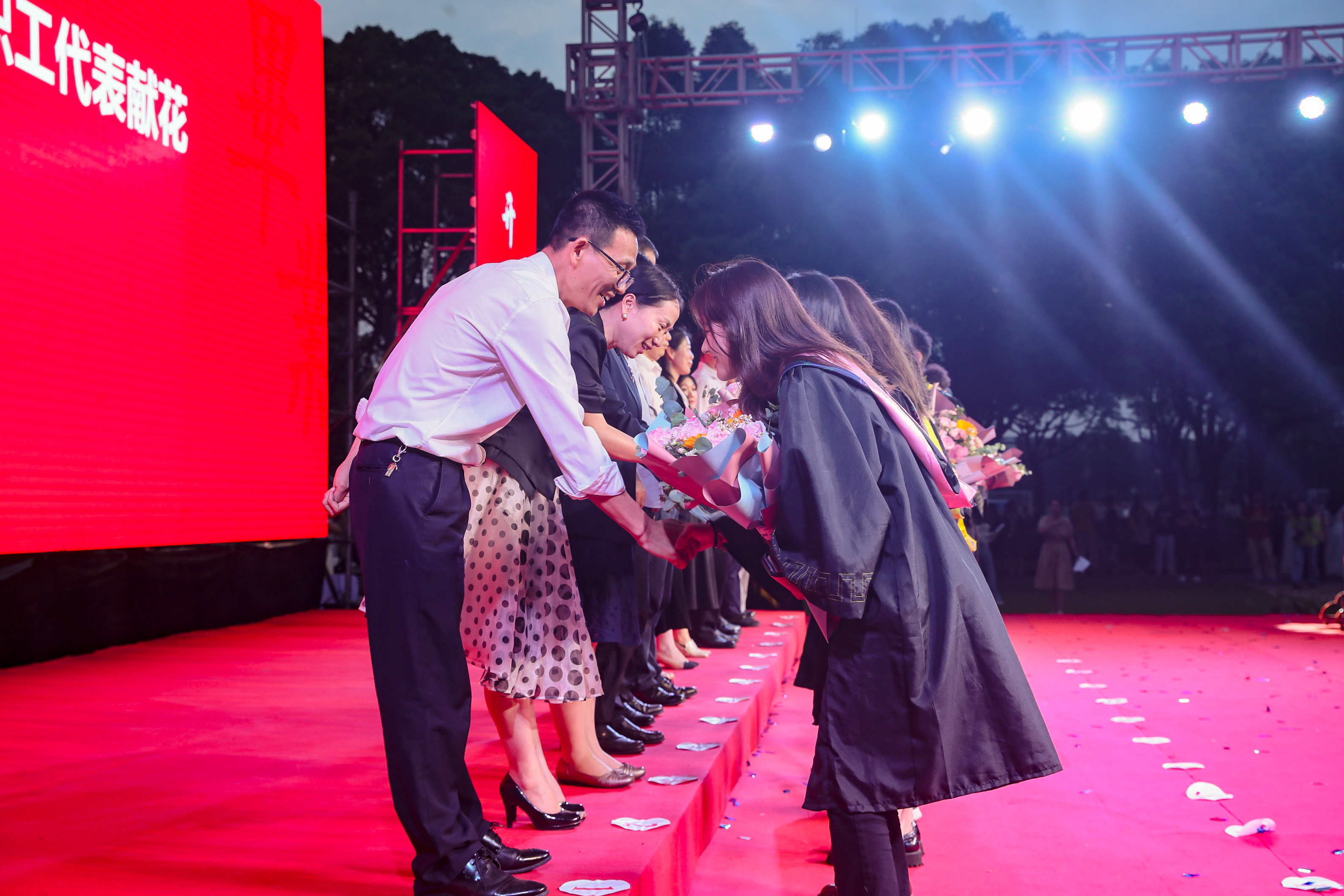 中美合作办学项目印第安纳波利斯大学校长罗伯特·曼纽尔博士、首席国际官兼副教务长玛丽·摩尔博士和商学院的金融学教授拉里·巴尔切尔博士发来的祝福视频,校友代表、教职工代表、在校生代表通过视频为毕业生们送上诚挚祝福。毕业生向教职员工代表献上鲜花,感谢师长、保卫、后勤员工等一路走来的呵护与教导。