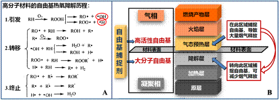 高分子材料自由基热降解历程(A)和“气相-凝聚相转移自由基捕捉”示意图