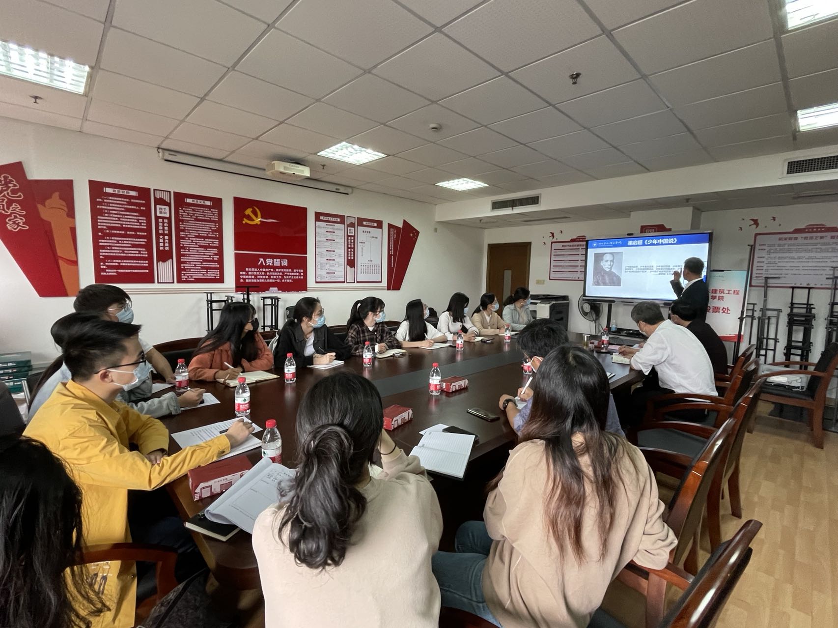 胡征宇同志号召在座党员要坚持党的领导,传承红色基因。党员师生要起到表率作用,从大局出发,坚持为党和人民事业服务,在青春的赛道上跑出最好成绩。
