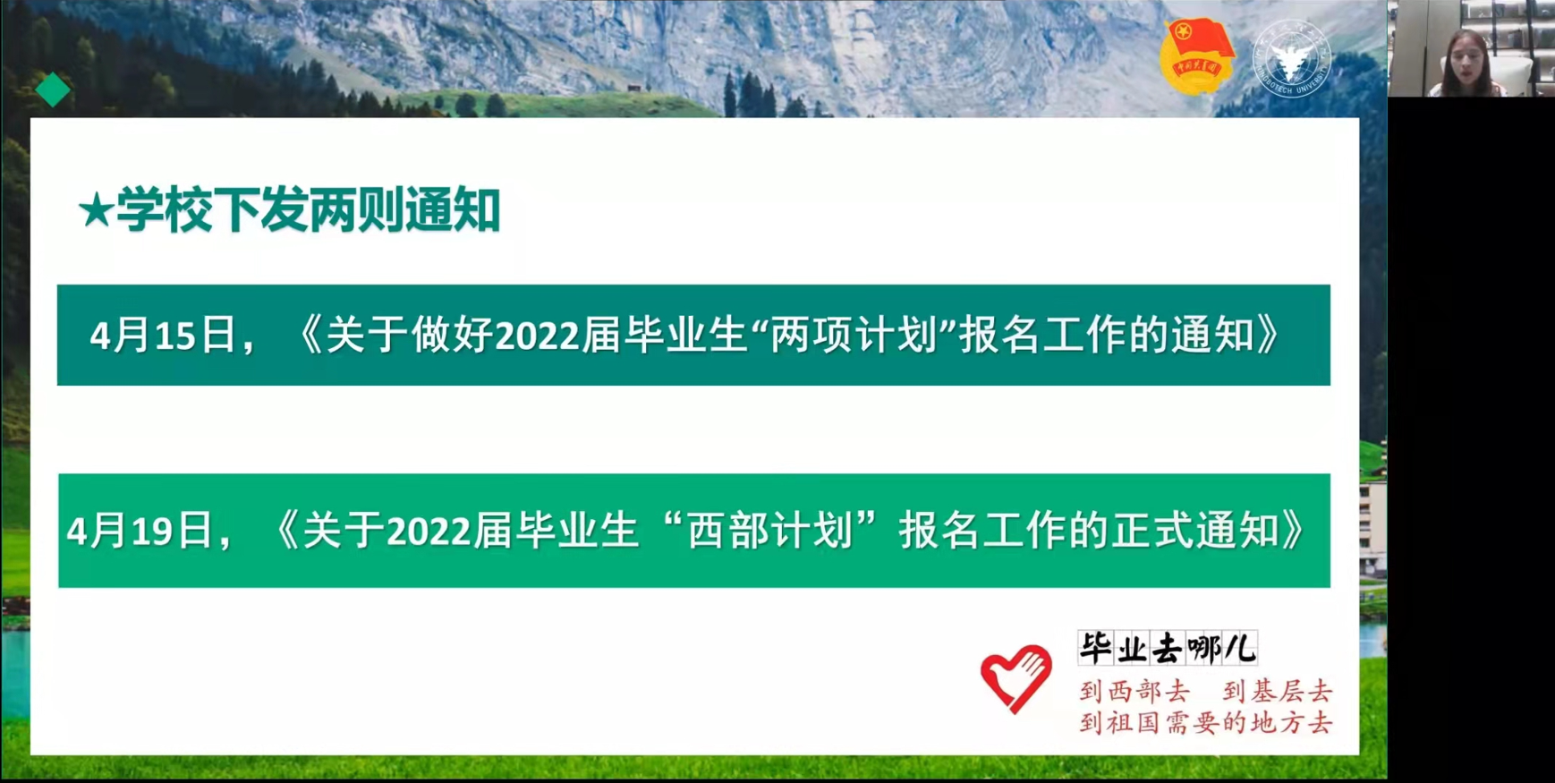 为进一步引导和鼓励毕业生到基层奉献青春、增长才干、就业创业,4月23日晚,“让青春在党和人民最需要的地方绽放”学校2022年“两项计划”动员会在线上顺利召开,校团委业务副主管陈艳、专职团干部梅呈龙、往届“两项计划”志愿者以及2018级毕业生们参加本次动员会。