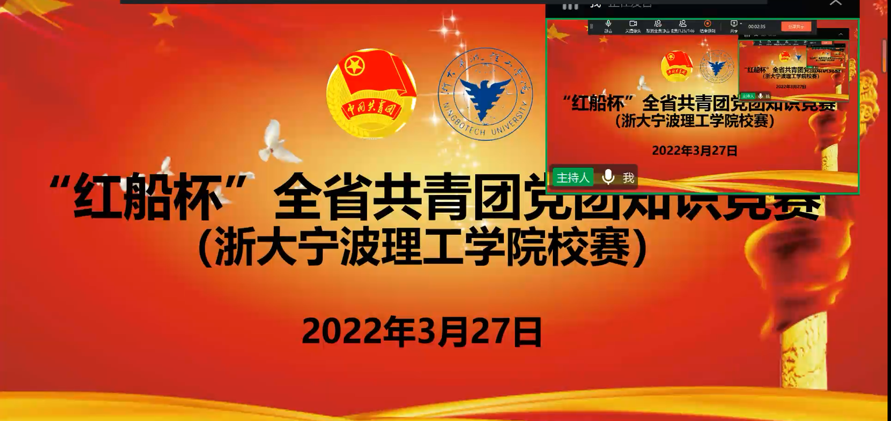 为迎接党的二十大召开、庆祝共青团成立100周年,教育引导广大团员青年深入学习党领导中国青年运动的光辉历程,为宁波加快建设现代化滨海大都市贡献青春力量,3月27日中午,学校团委举办“红船杯”全省共青团党团知识竞赛校赛。