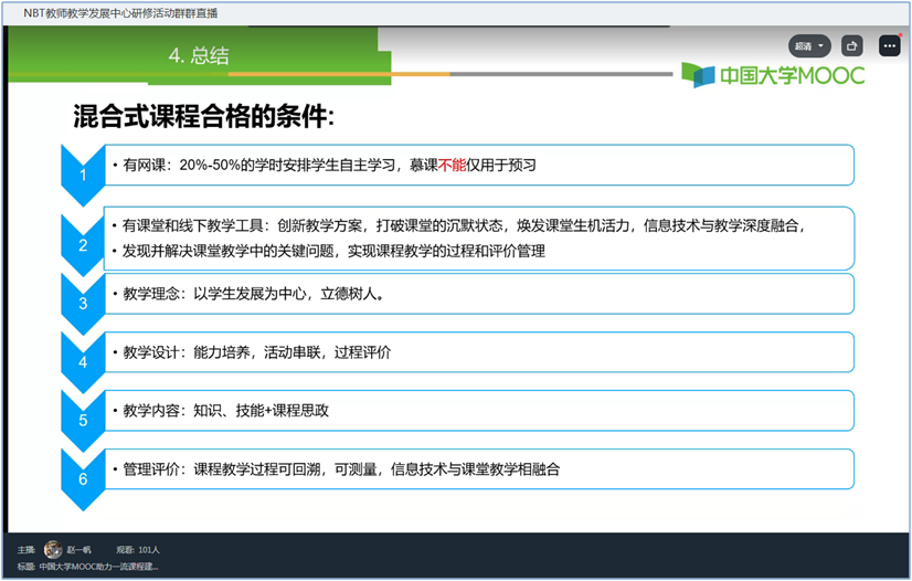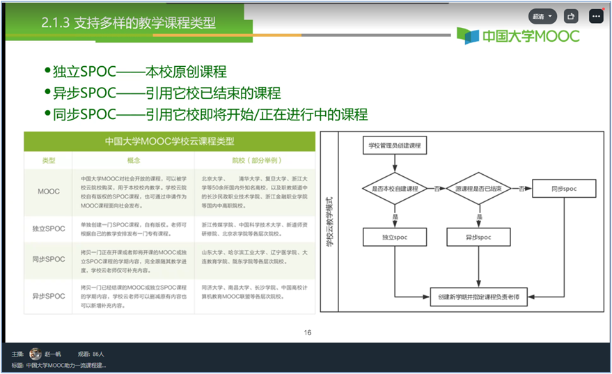 中国大学MOOC平台运营经理赵一帆对平台进行了介绍,从如何利用中国大学MOOC平台进行线上课程建设应用、如何利用线下教学工具慕课堂进行线上线下混合式教学等方面做了详细讲解。