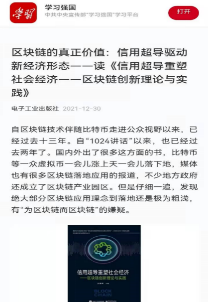 近日,中宣部“学习强国”学习平台大篇幅推介电子工业出版社撰写的“区块链的真正价值:信用超导驱动新经济形态——读《信用超导重塑社会经济——区块链创新理论与实践》”一文。该文章介绍的著作《信用超导重塑社会经济——区块链创新理论与实践》是由浙江大学教授、开云启新学者讲座教授、网络空间治理与数字经济法治(长三角)研究基地主任兼首席专家王春晖教授主编,电子工业出版社出版的。
