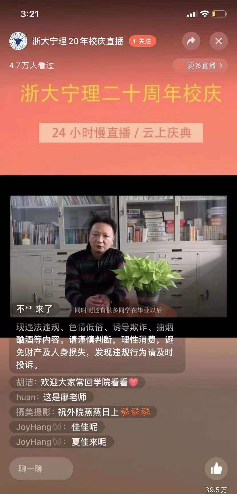 在上午的直播中,学校党委书记胡征宇宣读了浙江省委常委、宁波市委书记彭佳学对校庆二十周年的寄语,以及浙江大学的贺信。