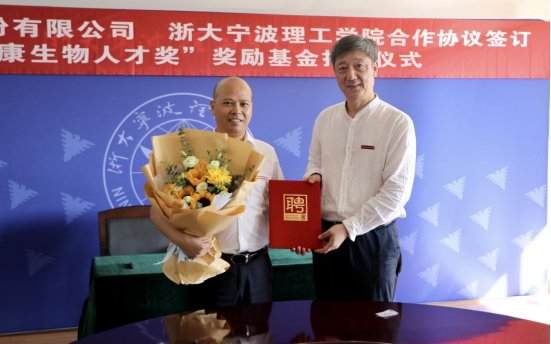 随后,双方举行了合作协议签订和奖励金捐赠仪式。学校聘任美康生物科技股份有限公司董事长邹炳德和总经理邹继华为学校产业教授,并由胡征宇书记为邹继华教授颁发证书、佩戴校徽。