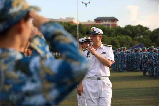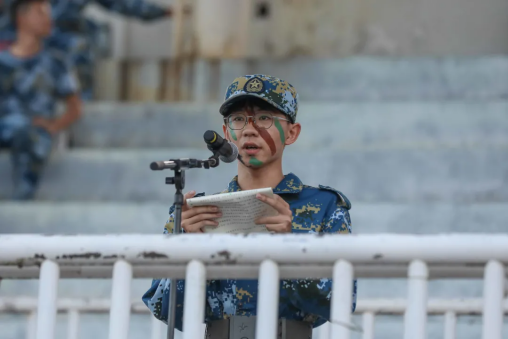 十八连单简同学代表参训学员发言。“在两周的军训生活中,我们刻苦训练、锻炼体魄、磨砺意志,都在努力成为像教官一样无畏挑战、顽强奋斗的战士!”。他感谢教官、指导员与班助们风雨兼程的陪伴和无微不至的关怀。“请教官放心,请老师放心,我们绝不是怯风怕雨的温室花朵,而是时刻准备搏击风雨展翅翱翔的雄鹰。我们将以青春和奋斗书写大学生活的美丽篇章。”